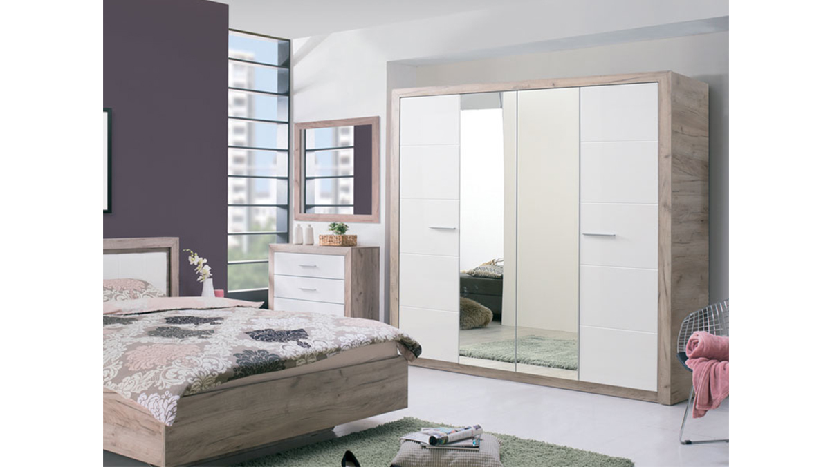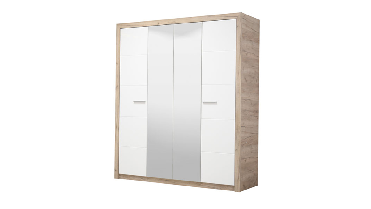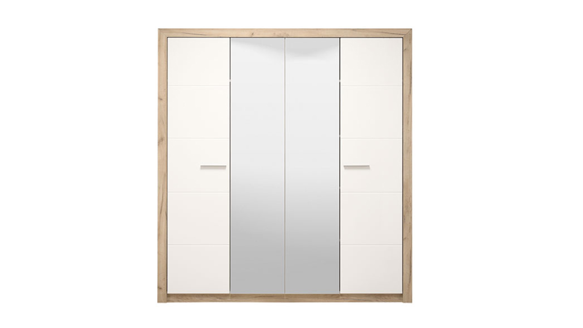 Ormar ASTOR 4K2O, sa kombinacijom dekora sivog hrasta i frontalnog dijela presvučenog bijelom lak folijom, posjeduje praktično organizovani upotrebni prostor sa sistemom polica pozicioniranim na lijevoj, i dio sa garderobnom šipkom i policom iznad nje na desnoj strani. Dodatni estetski benefit je ogledalo u središnjem dijelu.